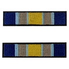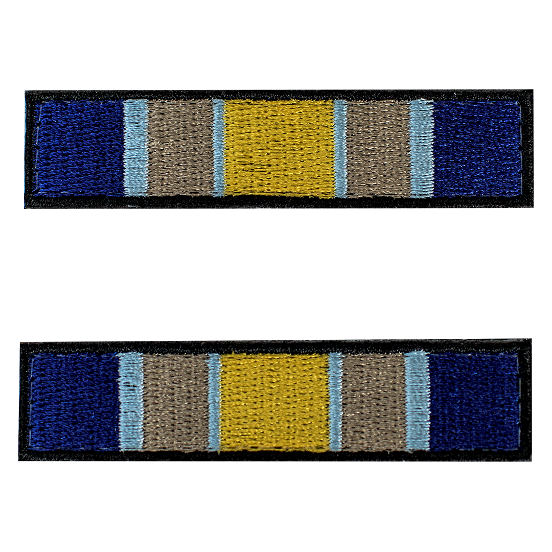 The Syrian Campaign ribbon consists of the following vertical stripes: The center of the ribbon is orange in color, surrounded by tan and blue, deriving its hues from the Ishtar Gate and the color of Southwest Eurasian topography, which is primarily sand.